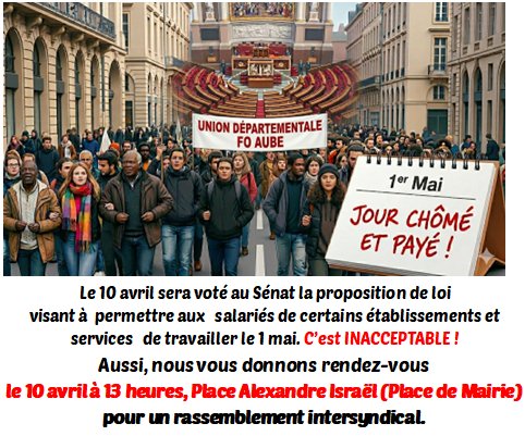 Le 10 avril sera voté au Sénat la proposition de loi visant à permettre aux salariés de certains établissements et services de travailler le 1er mai. C'est INADMISSIBLE !!!!